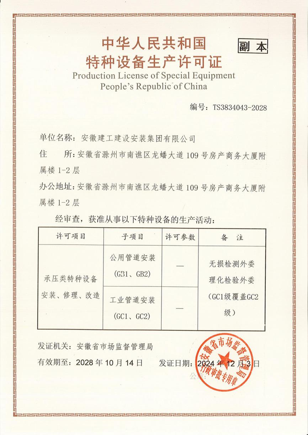 建工安裝順利完成壓力管道安裝許可證延續(xù)換證工作