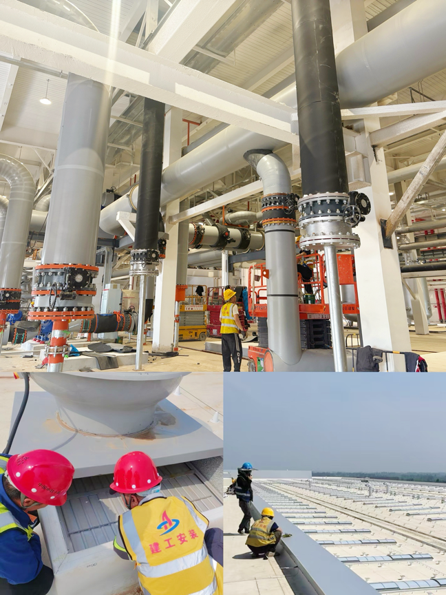 圖為新橋智能制造產(chǎn)業(yè)園項目部冷凍水管道保溫、屋面風(fēng)機(jī)調(diào)試、TPO屋面防雷接地施工